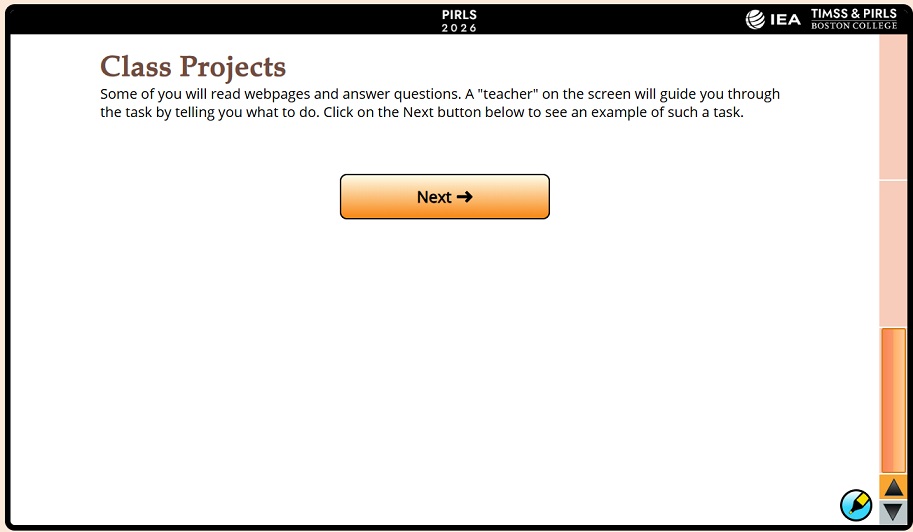 4. Ακολουθούν οι οδηγίες για τη συμπλήρωση του δοκιμίου αξιολόγησης. Για να προχωρήσετε, χρησιμοποιήστε τη γραμμή κύλισης στα δεξιά της οθόνης και κάντε κλικ στις διαφορετικές ενότητες. Αν θέλετε να δείτε τις ενδεικτικές ερωτήσεις, κάντε κλικ στο μεσαίο τμήμα της γραμμής κύλισης και επιλέξτε «Questions» στο κάτω μέρος της οθόνης. Μετακινηθείτε μέσα στις ερωτήσεις χρησιμοποιώντας τα πράσινα βέλη στο κάτω μέρος του παραθύρου των ερωτήσεων. Για να παραλείψετε τις ενδεικτικές ερωτήσεις, κάντε κλικ στο τελευταίο τμήμα της γραμμής κύλισης. Θα εμφανιστεί μια σελίδα που γράφει «Class Projects» στην κορυφή, όπως φαίνεται στο επόμενο στιγμιότυπο οθόνης.